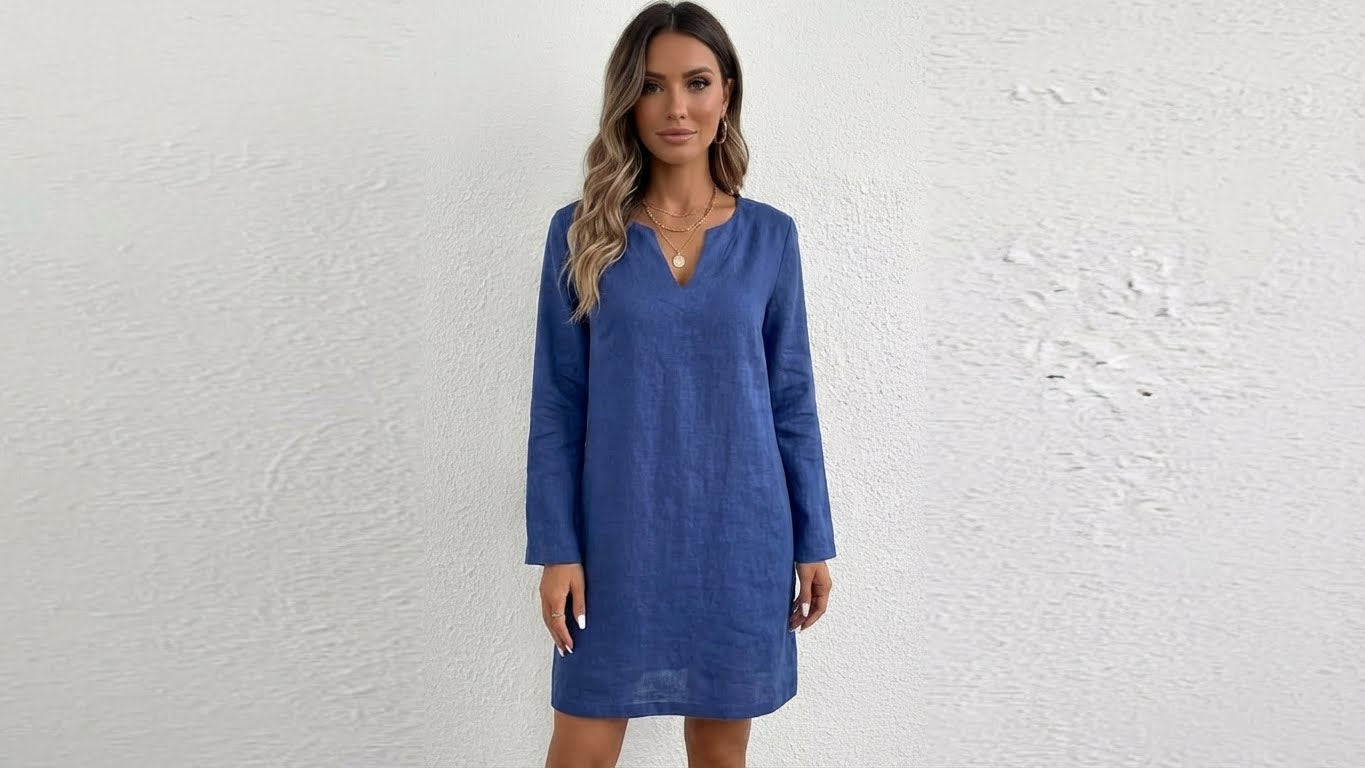 Este vestido está pensado para mujeres que buscan el equilibrio perfecto entre comodidad y estilo. El tejido flexible y el sutil escote en V garantizan un ajuste favorecedor, mientras que las mangas remangadas añaden un toque informal pero elegante.